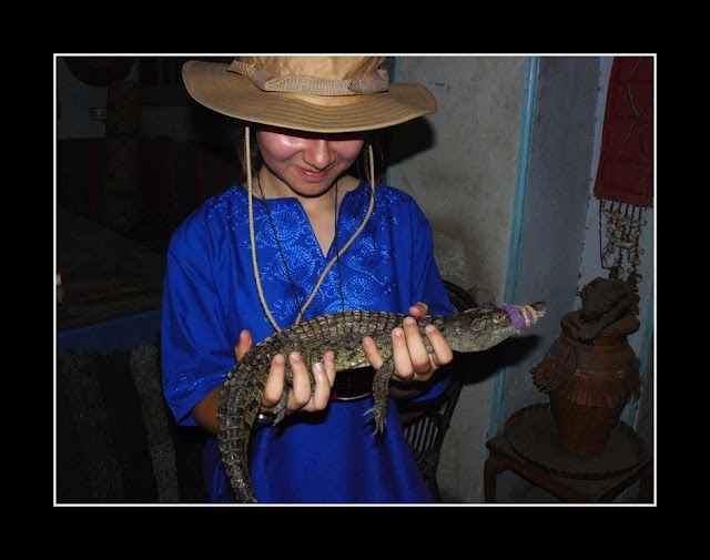 Wioska nazywa się Koti. Idziemy uliczkami, domy malowane w charakterystyczne wzory, wypłowiałe farby, cisza i głębokie cienie, ostro odcinające się od słonecznych plam. Zostajemy zaproszeni do domu, przed którym ustawiona jest martwa natura ze starą maszyną do szycia. To takie miejscowe, prywatne i żywe muzeum etnograficzne. Wchodzimy, siadamy przy stole obok grupki Niemców. Spektakl właśnie trwa. Brawa dla jedynego jakiego widziałyśmy krokodyla nilowego. Biedny, poniżony, nieletni bóg Sobek z nałożoną na pyszczek gumką do włosów, zostaje podawany do rąk ciekawych turystów. Odgryzł by się ale nie ma za bardzo jak. Na pobliskiej wyspie żyje ponoć jeden dorosły osobnik, przywieziony tu z Kairu i wypuszczony do Nilu. Nie zapytałam skąd wziął się ten maluch, pewnie i tak usłyszałabym legendę o wodach Nilu pełnych niebezpiecznych bestii, w sam raz dla turystów. Myślę, że prawda jest bardziej banalna. Złapany gdzieś w okolicach Sudanu lub w dalszym odcinku Nilu, został zakupiony i przywieziony tu jako jedna z atrakcji. Również biorę delikatnie do rąk zwierzątko. Ma miękki, delikatny, wręcz aksamitny brzuszek, a pod skórą naprężone jak struny mięśnie, jedna chwila, jeden ruch i będzie panem sytuacji. Oddaję go choć najchętniej wypuściłabym go na wolność. Pijemy karkadę, zwiedzamy wręcz muzealne pokoje. Właściciel słysząc, że jesteśmy z Polski, rozpromienia się cały. Zna piłkarzy i sukcesy dawno przebrzmiałe naszego kraju w tej dyscyplinie. Płacimy, żegnamy się miło. Chcemy jeszcze zobaczyć pozostałą część wioski. Gospodarz woła dwóch chłopaków, oni oprowadzają nas uliczkami. Mają również wakacje, a to sposób by troszkę sobie dorobić. Każdy z nich oczywiście z papierosem w ręku. Egipcjanie tragicznie palą.